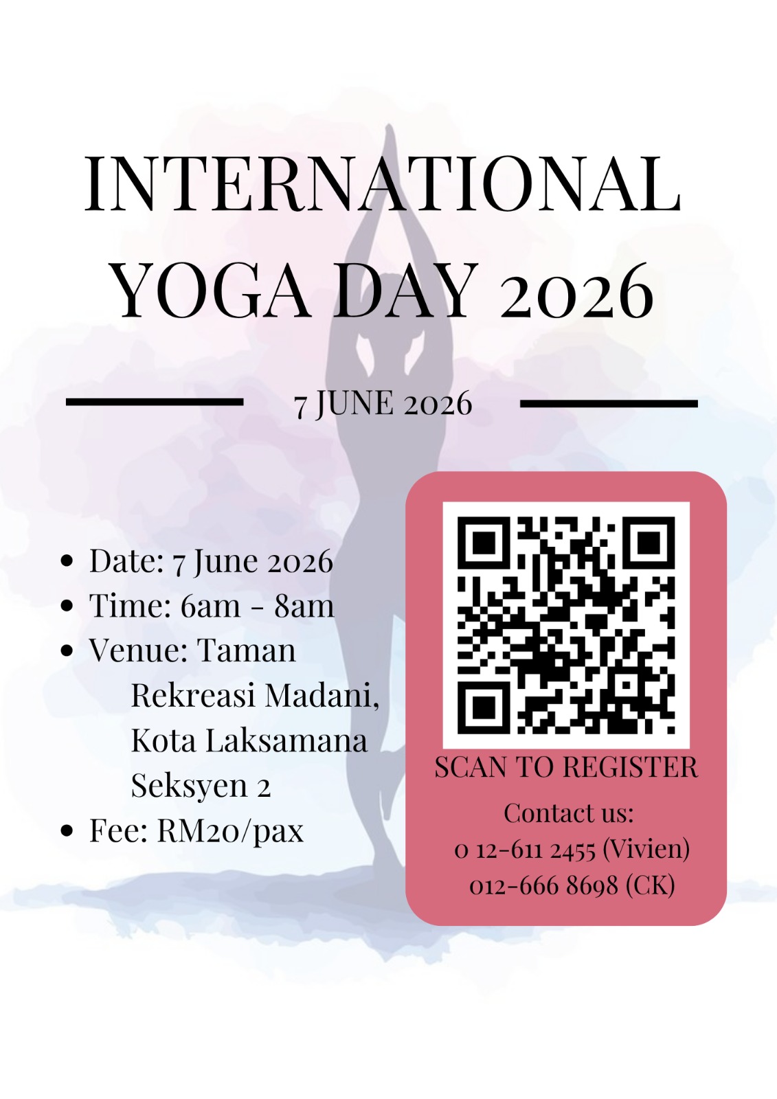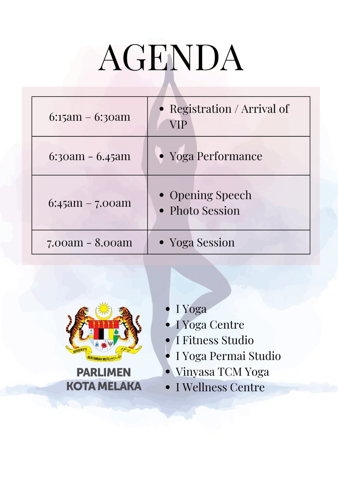 To celebrate International Yoga Day, the Melaka City Member of Parliament's office will join hands with 6 yoga studios to organize an outdoor yoga event to give back to the community by promoting yoga, and advocating a healthy lifestyle.